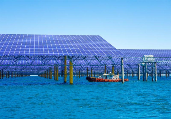国内首个桩基固定式海上光伏项目——中广核招远40万千瓦海上光伏项目。摄影/王晟伟