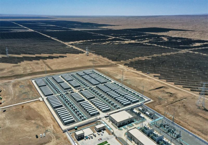 位于新疆莎车县的新华莎车100万千瓦光储一体化电站能有效改善光伏发电出力间歇性,促进地区新能源电力的稳定供应。摄影/王康